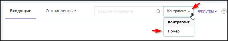 Перед вводом в поле поиска по списку документов нужно выбрать область поиска "Контрагент" или "Номер" справа от значка