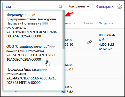 В случае поиска по реквизитам контрагента ниже поля поиска сразу после ввода данных открывается список с реквизитами контрагентов, полностью или частично совпадающих с введенным значением. Пример: