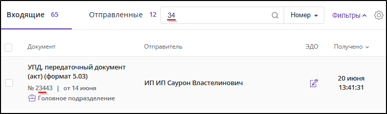В случае поиска по номеру или части номера документа сразу после ввода данных открывается список подходящих документов. Пример: