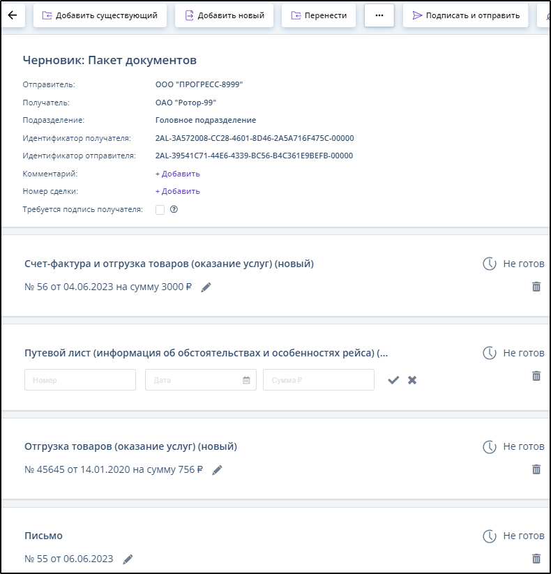 При создании пакета, как и при добавлении в него документов, сверяются данные получателя в документах пакета и данные получателя пакета.