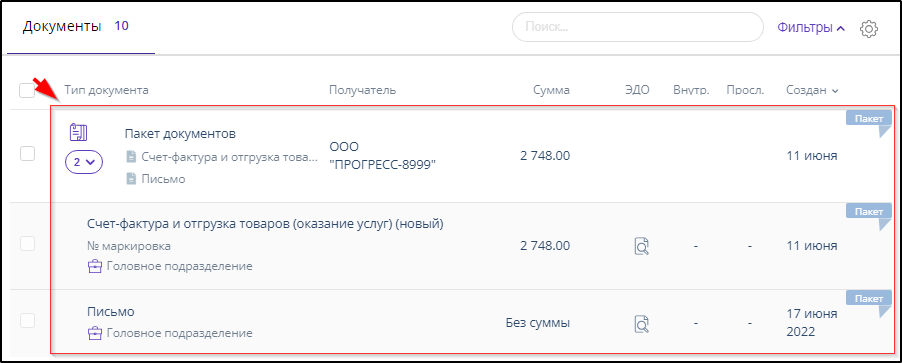 Документы, в количестве до 30 и не находящиеся в стадии подписания или согласования, можно объединять в пакеты для удобства выполнения групповых действий над ними как на стороне отправителя, так и на стороне получателя.