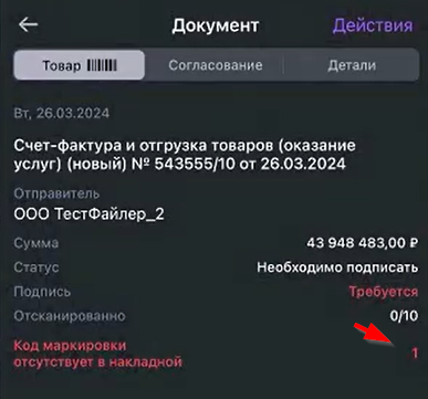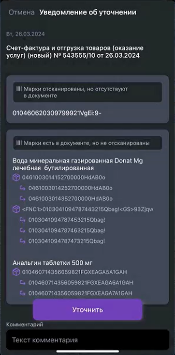Если отсканированный для сверки код отсутствует в счёте-фактуре (накладной) или сканируется повторно, то отображается соответствующее сообщение и кнопки, позволяющие повторить сканирование или добавить код маркировки в уведомление об уточнении.