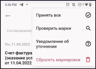 Пункт "Сбросить маркировки" или "Сбросить отскан. коды" предназначен для удаления результатов сверки кодов маркировки.