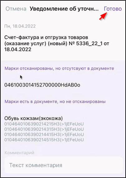 После выбора пункта "Уведомление об уточнении" или "Уточнить" открывается Уведомление об уточнении со списком выявленных расхождений, к которому можно добавить комментарий и отправить кнопкой "Готово" или