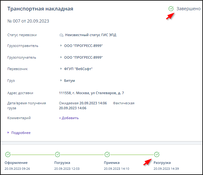 Накладная в разделе "ЭПД" после отправки Титула 4 получает статус "Завершено", выполненный этап "Разгрузка" отмечается зелёной галочкой. Пример: