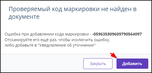 Если введенного (введенных) кода (кодов) нет в счете-фактуре, то отображается сообщение с введенным кодом (кодами). Для добавления кода в уведомление об уточнении нужно нажать кнопку "Добавить". Пример: