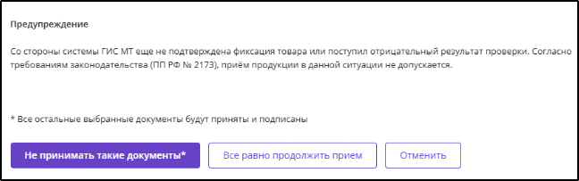 В случае приёмки маркированной продукции при отсутствии квитанции от ГИС МТ с информацией о положительном результате проверки МОД после нажатия кнопки