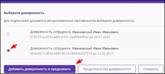 5. Если у пользователя есть действующие доверенности, зарегистрированные в системе, то в следующем окне нужно выбрать (отметить большой точкой в кружке) доверенность, информация которой будет использована, и нажать кнопку